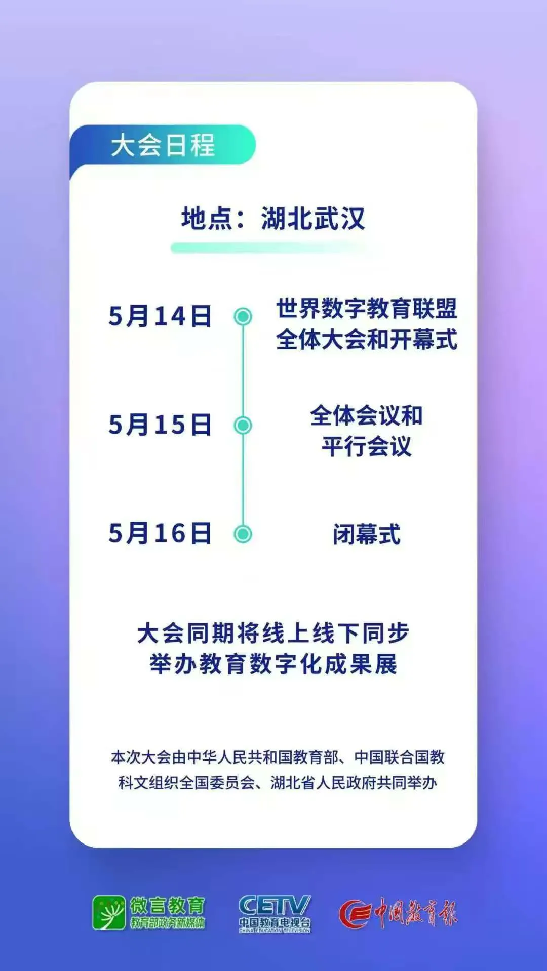 官網(wǎng)顯示,5月14日將舉行世界數(shù)字教育聯(lián)盟全體大會和開幕式,15日舉行全體會議和平行會議,16日舉行閉幕式。大會同期將線上線下同步舉辦教育數(shù)字化成果展。