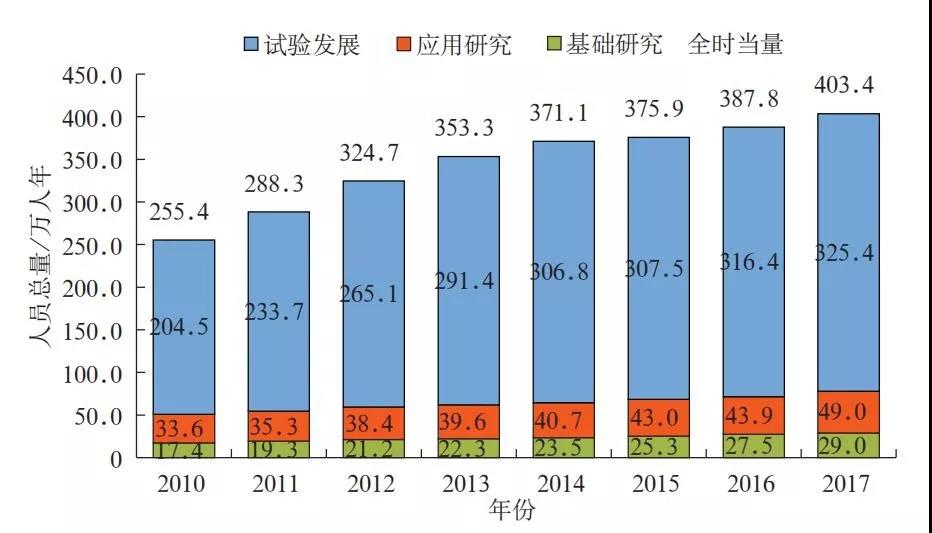 三類研究類型的R&D人員數(shù)量均持續(xù)增加。2017年我國R&D人員(全時當量)為403.4萬人年,其中從事試驗發(fā)展的人員有325.4萬人年,占80.7%;從事應用研究的人員為49.0萬人年,占12.1%;從事基礎研究的人員為29.0萬人年,占7.2%。2010-2017年,三類研究類型的R&D人員數(shù)量均有不同程度的增長,其中從事基礎研究的R&D人員增速最快。(見圖1)。