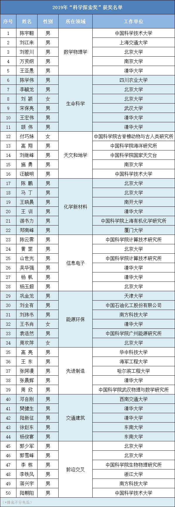 2019年度“科學(xué)探索獎”獲獎人來自全國11個省市的26個科研單位、高校和企業(yè)。為了選拔和激勵更多青年科技工作者,經(jīng)過評審委員會決定,在獎項評審中采用“新星機制”——在同等申報條件下,年紀更輕者勝出。最終50位獲獎人中,35歲及以下獲獎人有9位,比例接近20%,充分體現(xiàn)了該獎項激勵青年科技工作者的初衷。