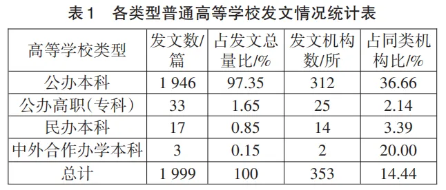 在納入統(tǒng)計范圍的2151篇高等教育科研論文中,剔除第一作者署名單位為境外高校(含港澳臺)以及政府機關(guān)、教育服務機構(gòu)、科研院所、軍事院校等的文章152篇,獲得第一作者署名單位為境內(nèi)普通高校的高等教育科研論文共計1999篇,以此作為本分析報告的數(shù)據(jù)基礎(chǔ)。