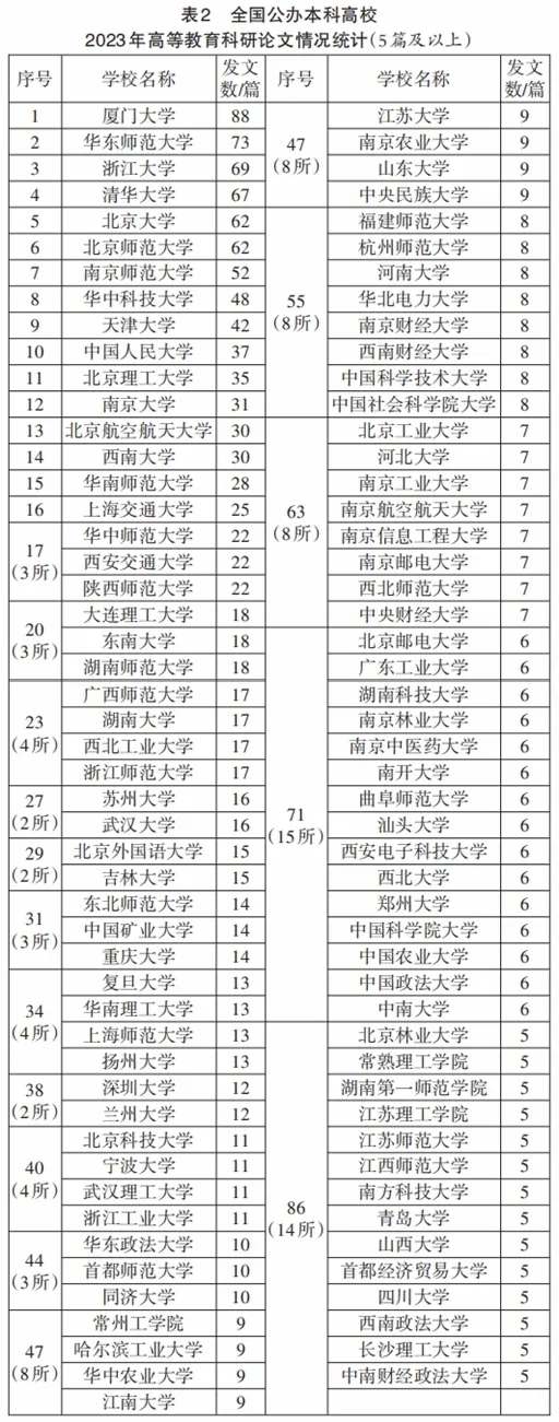 為更好地跟蹤、掌握我國高等教育科學研究的現(xiàn)狀與特征,服務于中國教育學自主知識體系建構(gòu),《中國高教研究》編輯部近期完成了2023年全國高校高等教育科研論文的統(tǒng)計分析工作。本次統(tǒng)計論文收錄期刊的范圍為中文社會科學引文索引(CSSCI)(2023—2024年)與《中文核心期刊要目總覽》(2023年版)中高等教育類“雙核”期刊,以及復合影響因子2.9以上、綜合影響因子2.1以上的教育綜合類“雙核”期刊,且均為“2022年度中國人文社會科學期刊AMI綜合評價”收錄期刊,共計23家。