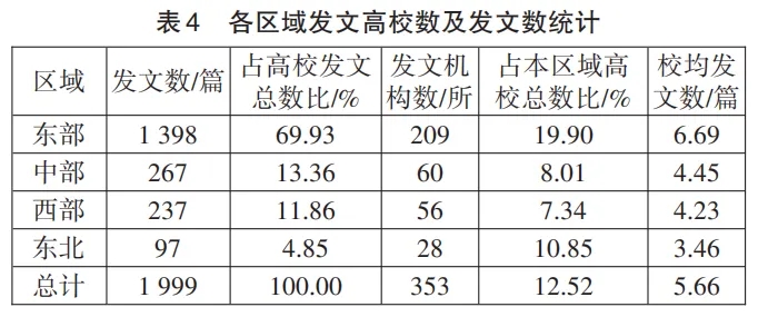 2023年東部地區(qū)高等教育科研發(fā)文高校占本區(qū)域高校總數(shù)的比例接近20%,相比之下其他3個區(qū)域的占比偏低;從區(qū)域高校發(fā)文數(shù)量與占高校發(fā)文總數(shù)的比例來看,東部地區(qū)也遙遙領(lǐng)先;從校均發(fā)文來看,東部地區(qū)校均發(fā)文6.69篇,遠高于中部地區(qū)的4.45篇,西部地區(qū)的4.23篇、東北地區(qū)的3.46篇。