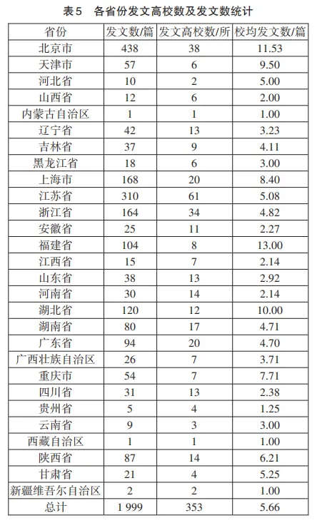 從省域分布來看,2023年度高等教育科研發(fā)文總量超過100篇的有6個省份,分別為北京、江蘇、上海、浙江、湖北、福建;從校均發(fā)文來看,福建、北京、湖北、天津、上海、重慶、陜西超過全國平均水平;海南、青海、寧夏3省區(qū)無高校發(fā)文。(見表5)數(shù)據(jù)顯示的高發(fā)文量和校均發(fā)文量一方面與高等教育資源優(yōu)勢省份呈現(xiàn)一致性,如優(yōu)質(zhì)高等教育資源集聚的北京、天津、上海、江蘇、湖北、浙江等都是論文高產(chǎn)出省份;另一方面也與高等教育學科發(fā)展的優(yōu)勢高校所在省份表現(xiàn)出高度的一致性,如作為高等教育學科優(yōu)勢高校的廈門大學一校的發(fā)文量占到全省發(fā)文量的84.62%,天津大學、華東師范大學、浙江大學、華中科技大學分別占到其所在省份發(fā)文量的73.68%、43.45%、42.07%、40.00%,成為省域發(fā)文的產(chǎn)出大戶。