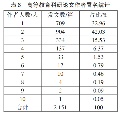 在統(tǒng)計作者署名情況的2151篇論文中,兩人聯(lián)合署名是占比最高的署名形式,其次為單獨署名。統(tǒng)計發(fā)現(xiàn),聯(lián)合署名的總占比達67.04%,這顯示出高等教育科研活動中合作研究已經(jīng)成為主流方式,呈現(xiàn)出有組織科研的雛形。高等教育學科發(fā)展進入成熟化階段,跨學科、跨主體的研究越來越深入,采用多樣化的研究方法、多學科的研究視角、多主體的信息采集方式使得不同背景的研究者組建起復合型研究團隊開展更深入、更廣闊的有組織研究。(見表6)以團隊形態(tài)開展的高等教育研究主題值得進一步分析挖掘,以反映高等教育科研的深層次結(jié)構(gòu)。