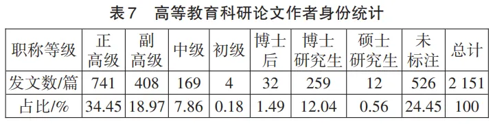 在職稱方面,論文統(tǒng)計顯示作者隊伍中具有副高級及以上職稱的人員比例較高,合計占比達到53.42%。在被統(tǒng)計的2151篇論文中,有1625篇論文的作者有職稱說明。如按照有標注職稱說明的論文作為基數(shù)計算,擁有高級職稱的占比為70.71%。除此之外,博士研究生的占比也較高。(見表7)由此反映出高影響力學術(shù)期刊凝聚著一批以資深專家學者為主要研究力量和以博士研究生群體為新生代力量的研究隊伍。