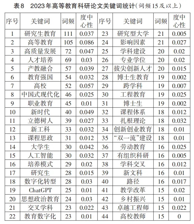 綜合考量高頻關(guān)鍵詞的詞頻和度中心性的分布情況并征求多位專家意見后,確定2023年度高等教育研究十大學術(shù)熱點,分別為教育高質(zhì)量發(fā)展、建設(shè)教育強國、產(chǎn)教融合與校企合作、人才培養(yǎng)改革、教育數(shù)字化與智能化、新工科建設(shè)、課程思政、交叉學科、創(chuàng)新創(chuàng)業(yè)教育、勞動教育。本刊邀請了十位專家學者聚焦十大學術(shù)熱點展開研究評述,以反映各熱點領(lǐng)域的學術(shù)動態(tài)與發(fā)展趨勢。