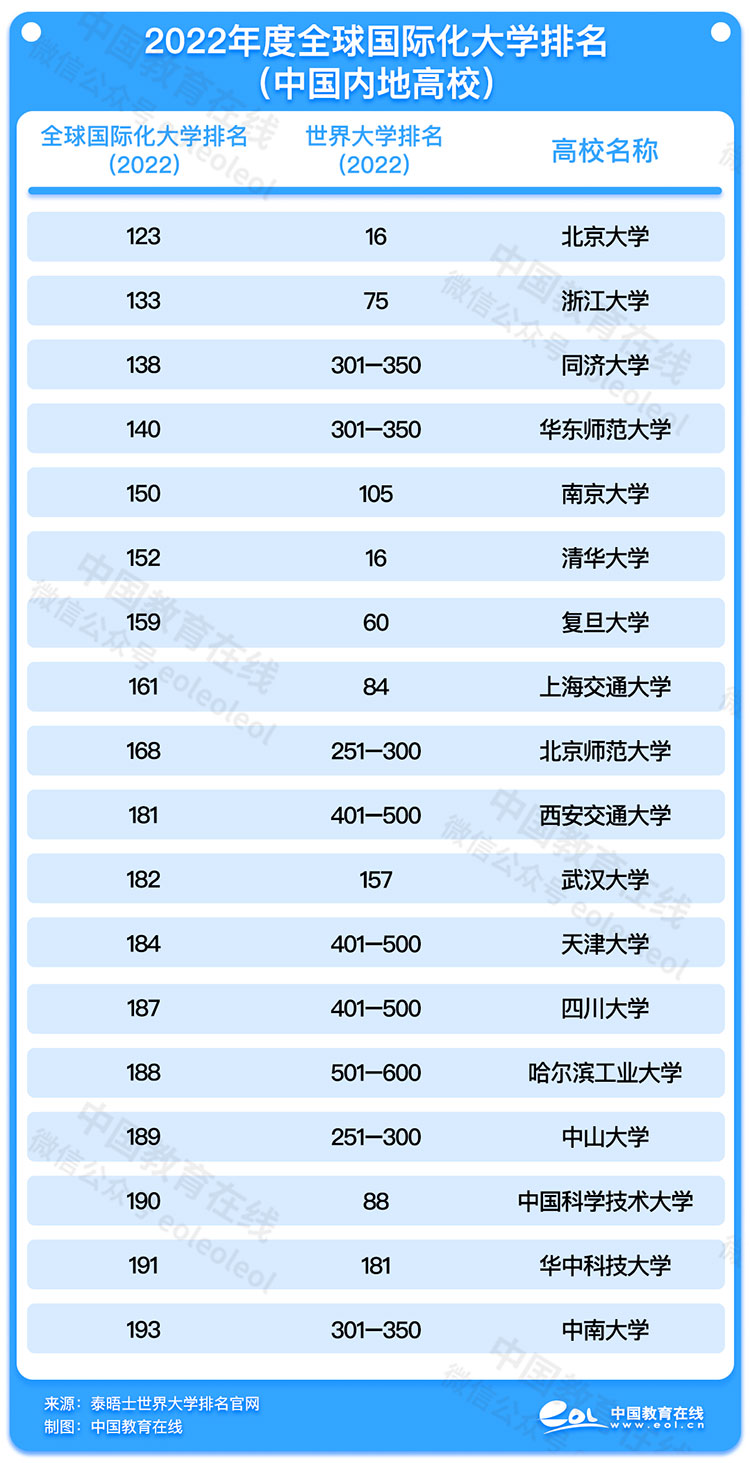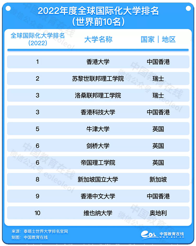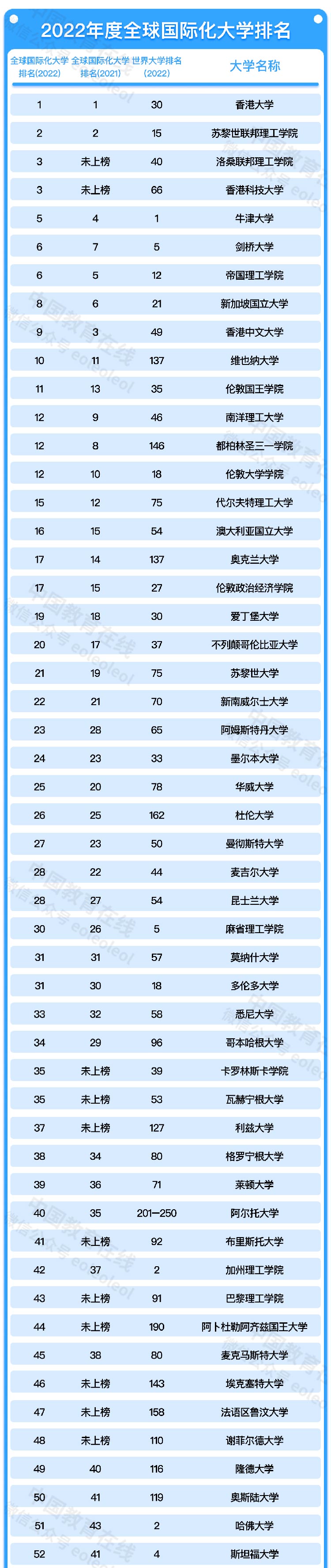2022年1月19日,泰晤士高等教育發(fā)布2022年度全球國際化大學(xué)榜單,該排名使用泰晤士高等教育2022年度世界大學(xué)系列排名數(shù)據(jù)中,全球各大學(xué)在國際學(xué)生、國際職員、國際合著和國際聲譽指標上的得分編制而成。