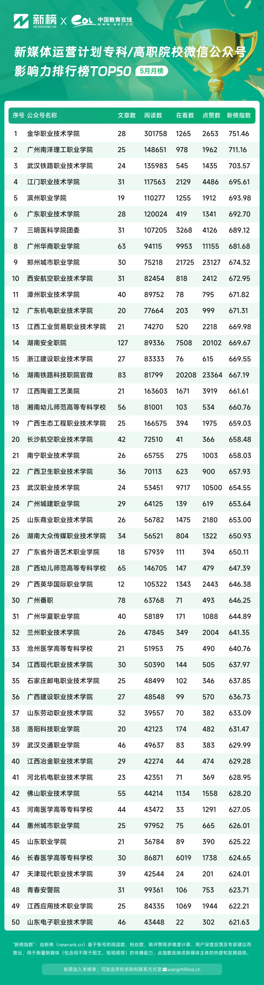 5月,中國教育在線新媒體運營計劃高職專科院校微信公眾號影響力排行榜TOP50中,@金華職業(yè)技術(shù)學院公眾號憑借751.46的新榜指數(shù)躍居榜單第一,@廣州南洋理工職業(yè)學院憑借711.16的影響力指數(shù)位居第二,@武漢鐵路職業(yè)技術(shù)學院以703.57的影響力指數(shù)位居榜單第三。
