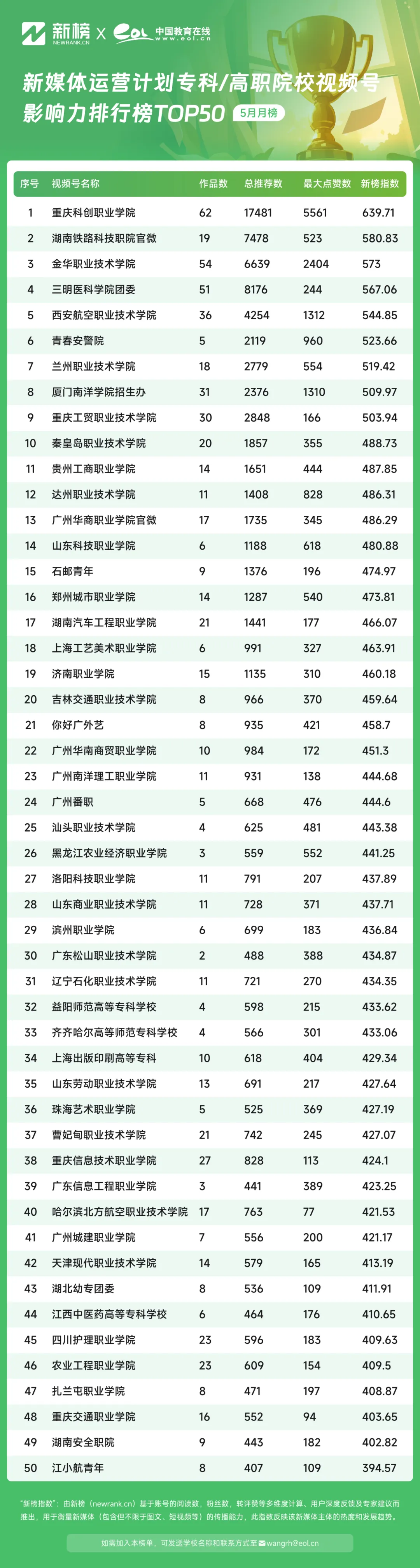 5月,中國教育在線新媒體運營計劃高職??圃盒R曨l號影響力排行榜TOP50中,@重慶科創(chuàng)職業(yè)學院視頻號憑借639.71的新榜指數(shù)躍居榜單第一,@湖南鐵路科技職院官微憑借580.83的影響力指數(shù)位居第二,@金華職業(yè)技術(shù)學院以573的影響力指數(shù)位居榜單第三。