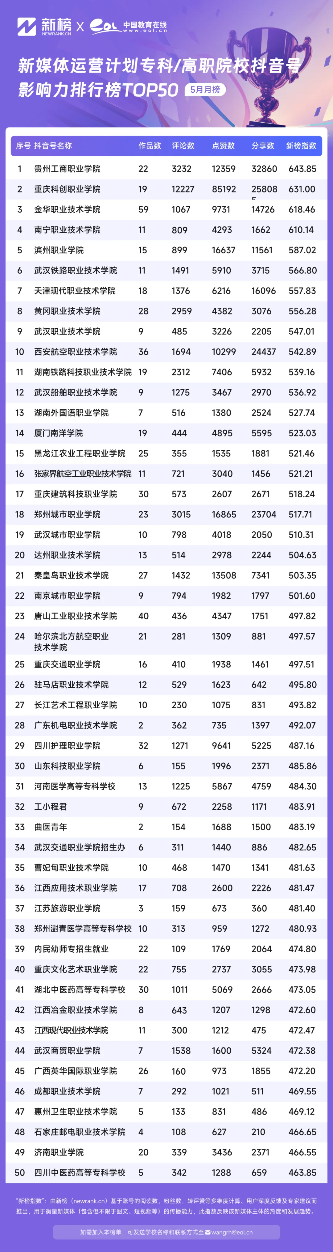 5月,中國教育在線新媒體運營計劃高職專科院校抖音影響力排行榜TOP50中,@貴州工商職業(yè)學院抖音號憑借643.85的新榜指數(shù)躍居榜單第一,@重慶科創(chuàng)職業(yè)學院憑借631.00的影響力指數(shù)位居第二,@金華職業(yè)技術(shù)學院以618.46的影響力指數(shù)位居榜單第三。
