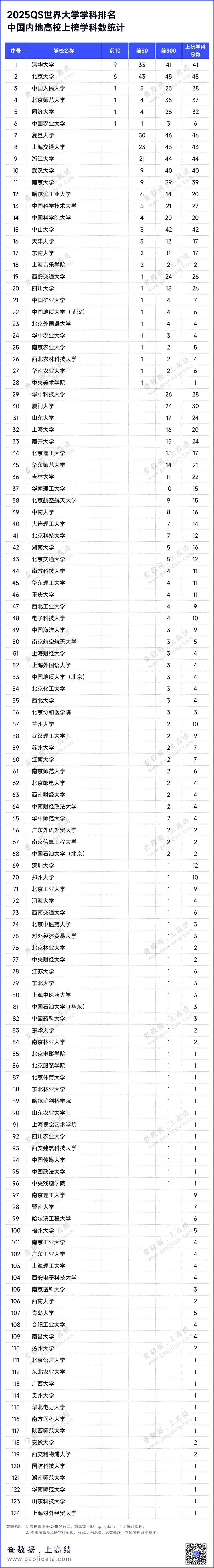 具體中國(guó)內(nèi)地高校上榜學(xué)科數(shù)統(tǒng)計(jì)如下: