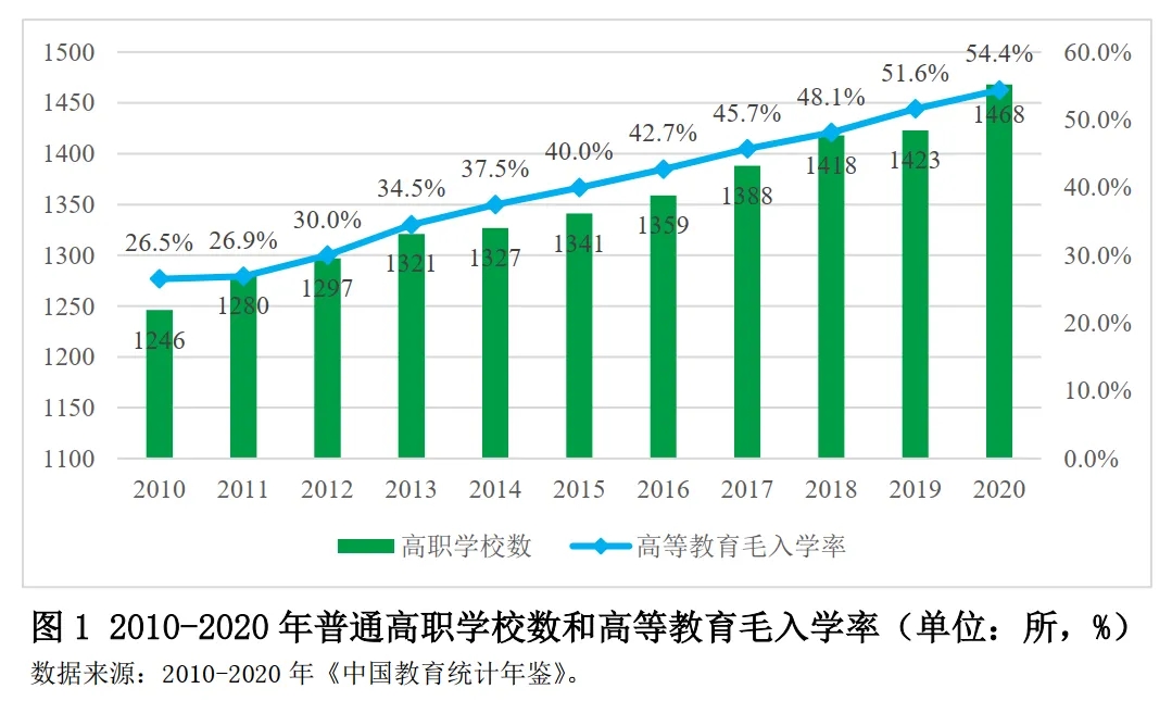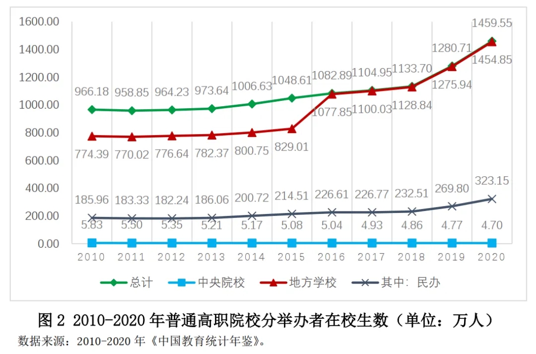 第一,我國高等職業(yè)教育仍處于規(guī)模擴(kuò)張階段。高職學(xué)校數(shù)量從2010年的1246所增加到2020年的1468所,十年間增長了17.82%。高職在校學(xué)生數(shù)十年間增長了32.55%。高職教育經(jīng)費投入逐年增長,生均教育經(jīng)費投入高于2.2萬元。