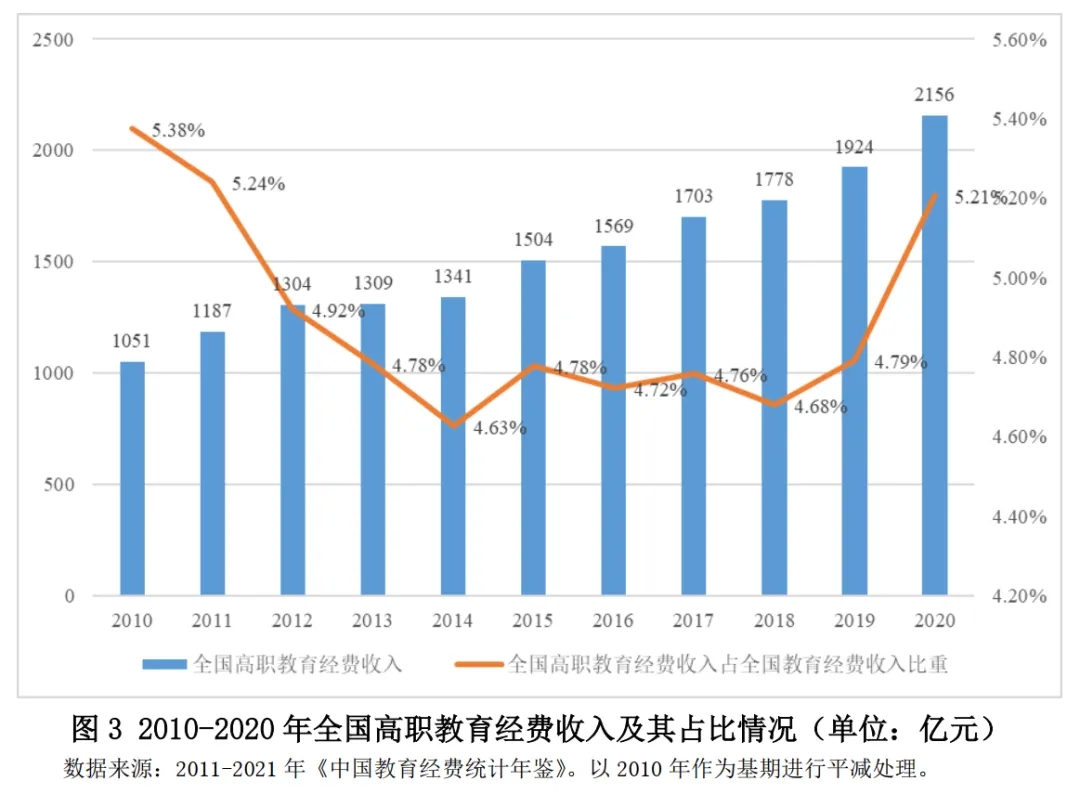 2010年以來,我國高等職業(yè)教育經(jīng)費投入逐年增加。2010年,我國高職教育經(jīng)費收入為約1051億元,2016年上升為約1569億元,到2020年,我國高職教育經(jīng)費投入已經(jīng)達(dá)到約2156億元,增長了約105%?!笆濉币?guī)劃期間,全國高職教育經(jīng)費收入占全國教育經(jīng)費收入比重穩(wěn)定在4.7%左右,到2019年略有上升,接近4.80%,2020年上升較快,超過了5%。(圖3)