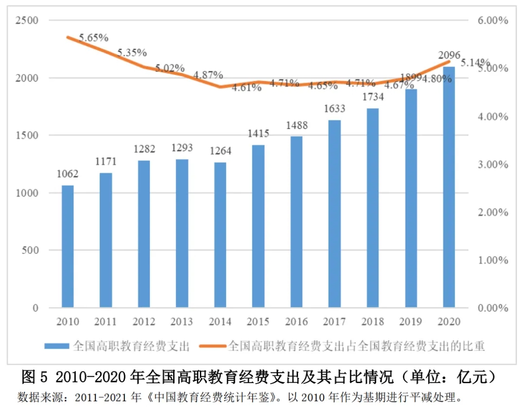 在高等職業(yè)教育經(jīng)費收入增長的背景下,教育經(jīng)費支出也穩(wěn)步提升。自2010年以來,我國高等職業(yè)教育經(jīng)費支出不斷增長(見圖5),從2010年的約1062億元,上升到2016年的約1488億元,再增長到2020年的約2096億元,增加了約97%。此外,在此期間,我國高職教育經(jīng)費支出占全國教育經(jīng)費總支出的比重經(jīng)歷了先下降后上升的趨勢,從2010年的5.65%下降至2014年的4.71%,隨后穩(wěn)定在4.7%左右,2020年增加到5.14%,與高職經(jīng)費收入占比一致。