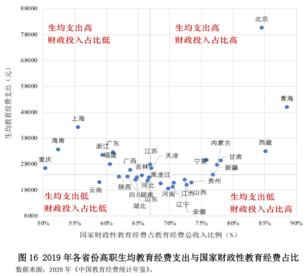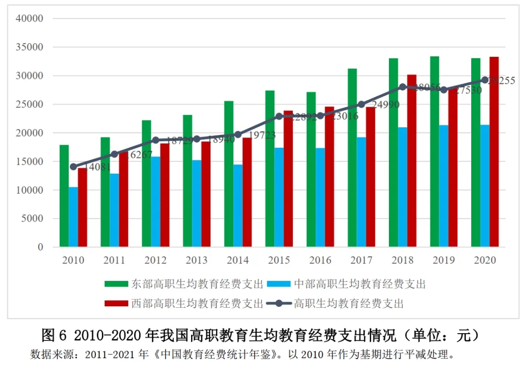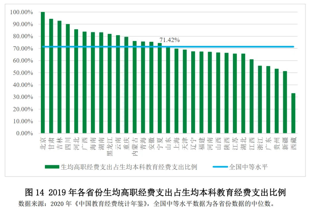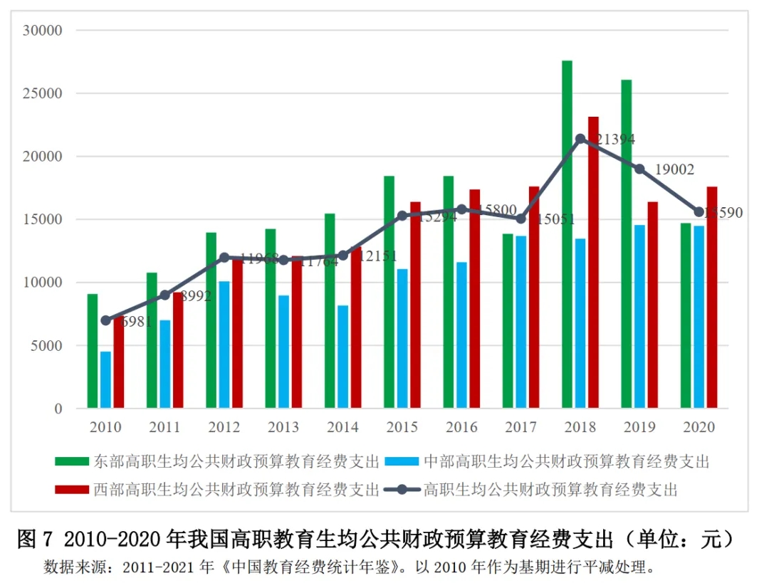 本報告存在以下幾個方面的局限。第一,省際差異基于對《中國教育經(jīng)費統(tǒng)計年鑒》的描述統(tǒng)計分析,沒有控制各省份院校類型、規(guī)模和結(jié)構(gòu)以及各省份經(jīng)濟(jì)與人口等因素,因此觀察到的省際差異除了反映各省份政府高職教育投入的努力程度,也反映了各省份社會經(jīng)濟(jì)發(fā)展差異和高等職業(yè)教育體系差異。