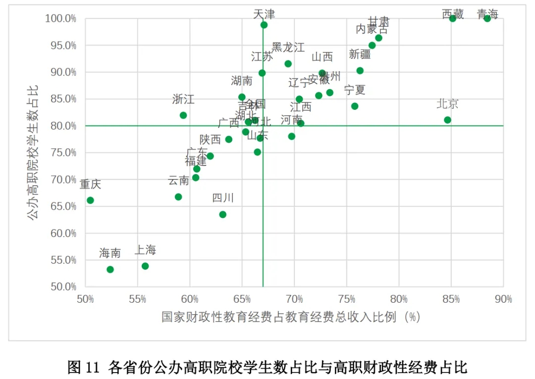 各省份情況可以劃分為四大類。第一類是以上海、重慶等省份為代表的“公辦高職院校學(xué)生數(shù)占比較低、財政性經(jīng)費占比較低”區(qū)域,此類區(qū)域呈現(xiàn)出多元主體辦學(xué)的局面,公辦高職院校學(xué)生規(guī)模相對較小,高職院校對財政性經(jīng)費收入的依賴程度較低,政府財政壓力較小。第二類是以青海、西藏、寧夏等省份為代表的“公辦高職院校學(xué)生數(shù)占比較高、財政性經(jīng)費占比較高”區(qū)域。這類省份的公辦高職院校學(xué)生數(shù)占據(jù)主導(dǎo)地位,且院校對財政性經(jīng)費收入的依賴程度較高。第三類是以河南等省份為代表的“公辦高職院校學(xué)生數(shù)占比較低、財政性經(jīng)費占比較高”區(qū)域,這些區(qū)域雖然民辦高職學(xué)生數(shù)占比較高,但是財政投入仍然是高職院校的主要收入來源。第四類是以浙江、湖南、山東等省份為代表的“公辦高職院校學(xué)生數(shù)占比較高、財政性經(jīng)費占比較低”區(qū)域,在公辦院校學(xué)生規(guī)模較大的情況下,政府財政投入水平相對不高。