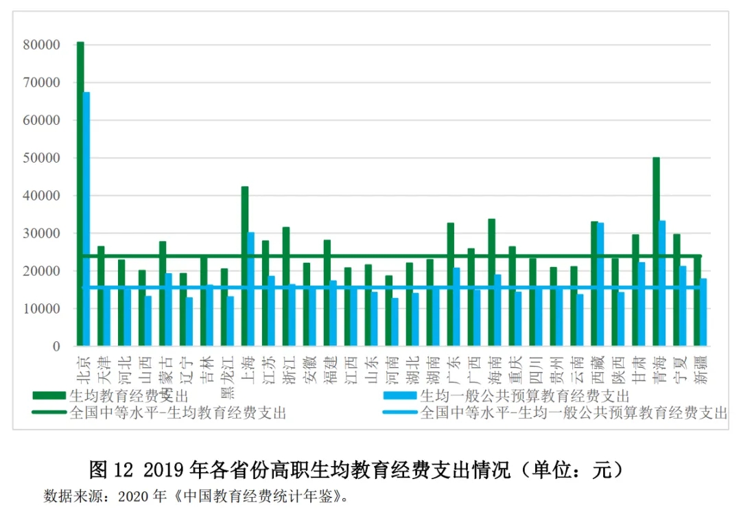 圖12反映了2019年各省份高職生均教育經(jīng)費支出情況及各省份之間的差異。整體而言,各省份的高職生均教育經(jīng)費支出情況與生均一般公共預(yù)算教育經(jīng)費支出情況類似,北京、青海、上海、西藏四個省份均位居前列,而黑龍江、山西、遼寧、河南四個省份均墊底。