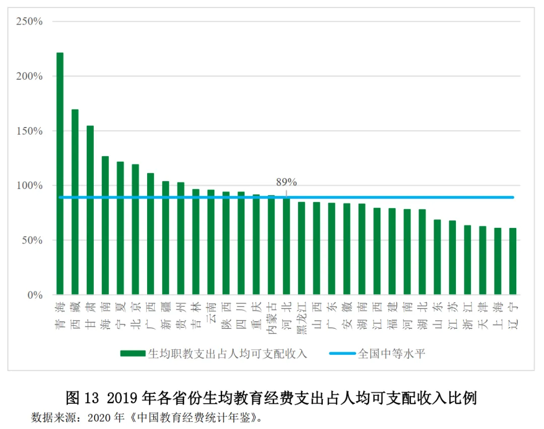 在經(jīng)費投入的充足性方面,與各省份人均可支配收入相比,全國高職院校生均教育經(jīng)費支出的中位數(shù)約為各省人均可支配收入的89%。具體到各省份,其中,青海、西藏、甘肅的生均教育經(jīng)費支出占人均可支配收入的比例較高,均超過150%,高等職業(yè)教育投入水平相對較高。山東、江蘇、浙江、天津、上海、遼寧的生均教育經(jīng)費支出占人均可支配收入的比例均低于70%,高等職業(yè)教育投入水平相對較低。(注:根據(jù)世界各國的高等教育生均經(jīng)費占人均GDP即通常所謂生均經(jīng)費指數(shù)的分析,由于規(guī)模效益等因素,生均經(jīng)費指數(shù)在高等教育較不發(fā)達(dá)的國家存在較高的現(xiàn)象,我國也是隨著高等教育的發(fā)展,生均經(jīng)費指數(shù)從超過100%逐步降低。相同的因素可能可以解釋此處的高職研究發(fā)現(xiàn),當(dāng)然嚴(yán)謹(jǐn)?shù)挠懻撚写M(jìn)一步的實證分析。)(圖13)