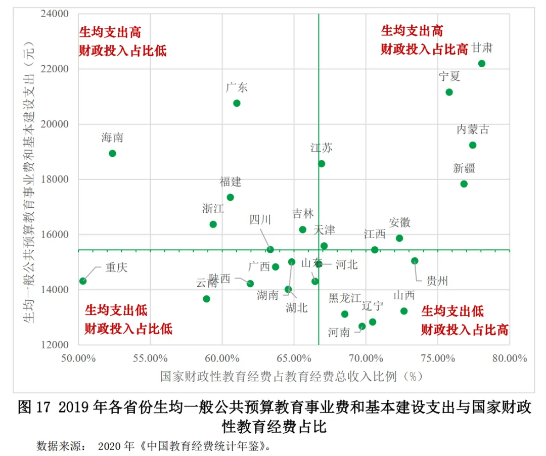 各省份可以分為四種類型:(1)多數(shù)西部地區(qū)屬于生均支出和財政投入程度都較高地區(qū);(2)廣東、海南、福建、浙江等東部地區(qū)的生均支出較高、但財政投入程度相對不高;(3)貴州、山西、遼寧等省份雖然財政投入程度較高,但是生均支出較低;(4)重慶、云南、陜西、湖南、湖北等西部和中部省份的生均支出和財政投入程度均處于較低的水平。(圖17)