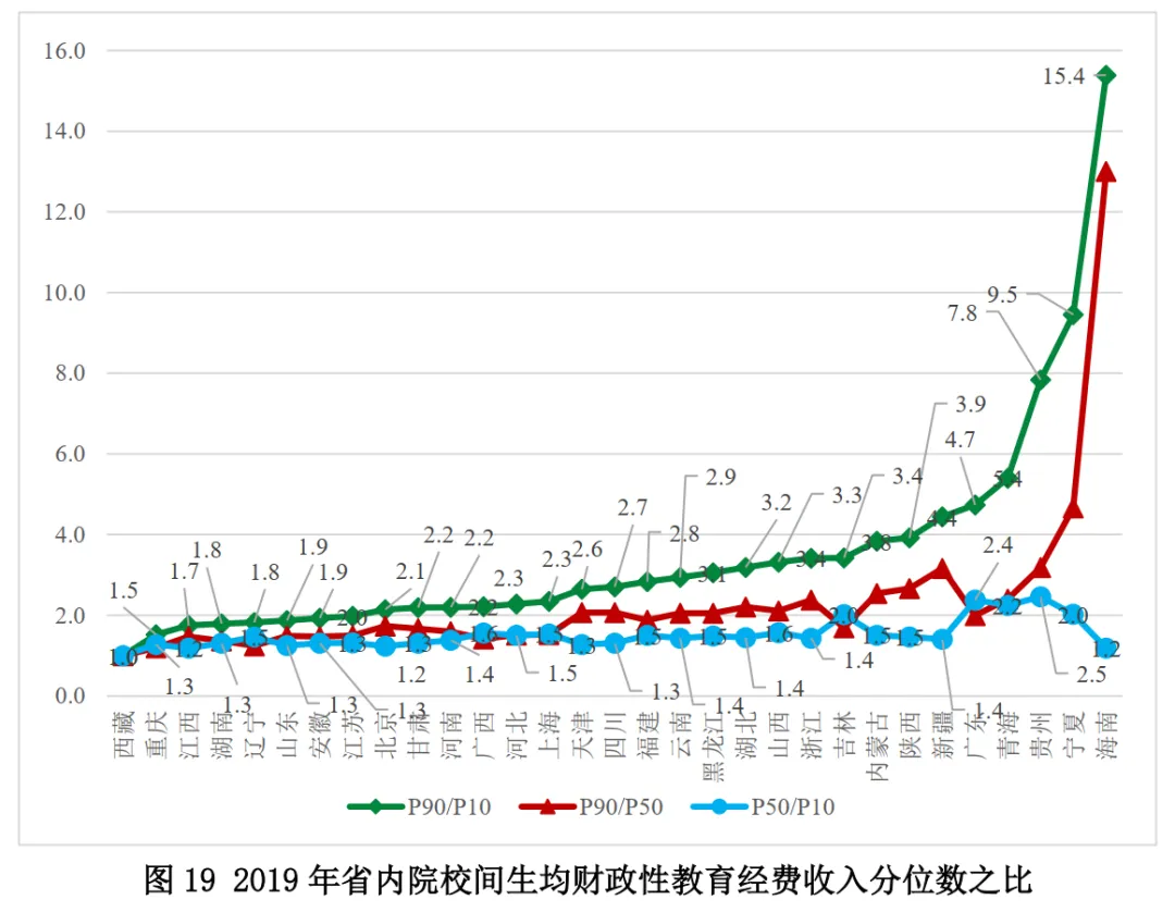 從2019年各省份生均財政性教育經(jīng)費收入的分位數(shù)之比來看:(1)西藏、重慶、江西、湖南的省內(nèi)均衡性位居前列;(2)海南、寧夏、貴州、青海位居最末。其中,海南和寧夏的P90/P10分別為15.4和9.5,且省內(nèi)生均財政性教育經(jīng)費收入最高的90分位數(shù)學(xué)校與居中的50分位數(shù)學(xué)校差異,遠(yuǎn)大于省內(nèi)生均財政性教育經(jīng)費收入居中的50分位數(shù)學(xué)校與最低的10分位數(shù)學(xué)校差異。(圖19)這意味著生均財政性教育經(jīng)費收入處于前50%位置的高校間差異是造成兩個省份,特別是海南省省內(nèi)生均財政性教育經(jīng)費收入差異的主要原因。