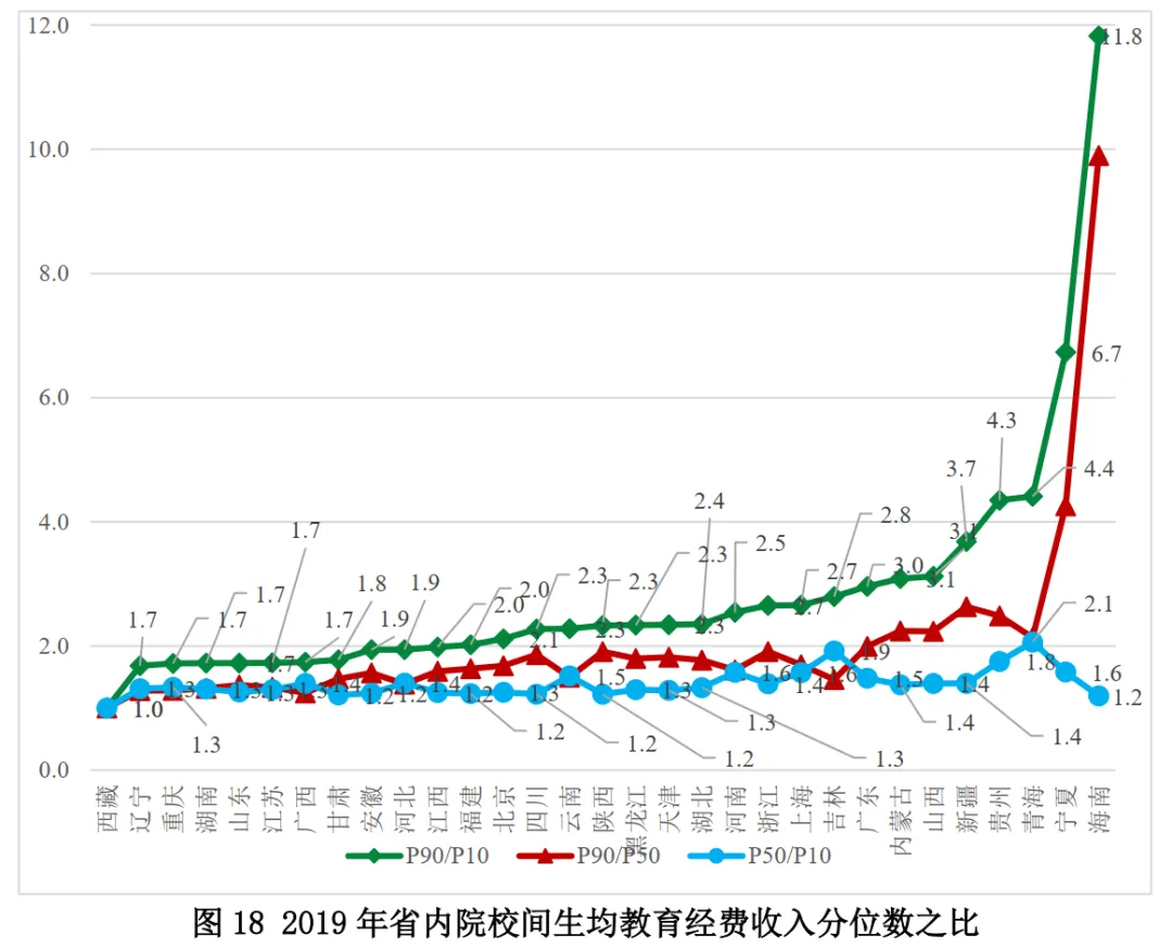 從2019年各省份生均教育經(jīng)費收入的分位數(shù)之比來看:(1)西藏、遼寧、重慶、湖南的分位數(shù)之比較小(小于等于1.7),省內(nèi)均衡性位居前列;(2)青海、寧夏、貴州、海南分位數(shù)之比較大(大于等于2),省內(nèi)均衡性位居最末。其中,海南和寧夏的P90/P10分別為11.8和6.7,且省內(nèi)生均教育經(jīng)費收入最高的90分位數(shù)學(xué)校與居中的50分位數(shù)學(xué)校差異,遠(yuǎn)大于省內(nèi)居中的50分位數(shù)學(xué)校與最低的10分位數(shù)學(xué)校差異。(圖18)這意味著生均教育經(jīng)費收入處于前50%位置的高校間差異是造成省內(nèi)生均教育經(jīng)費收入差異的主要原因。