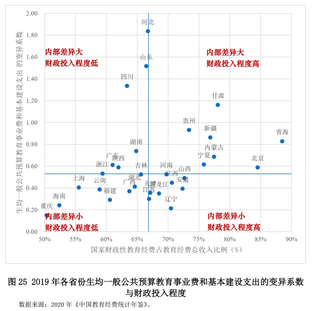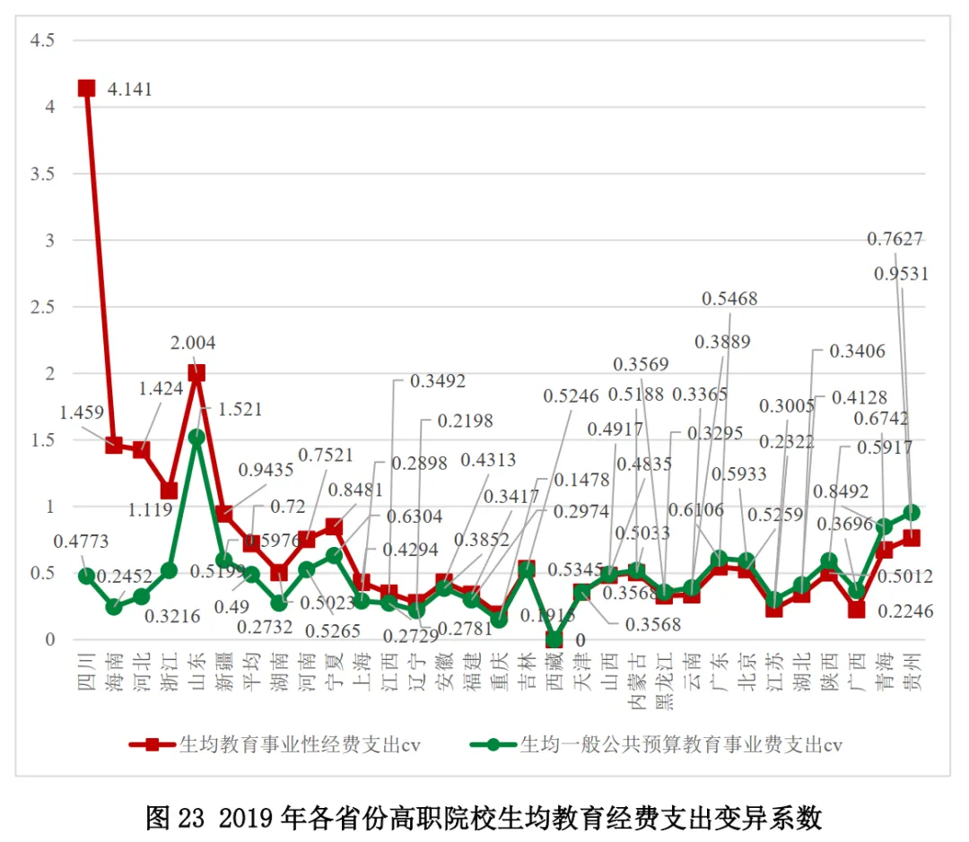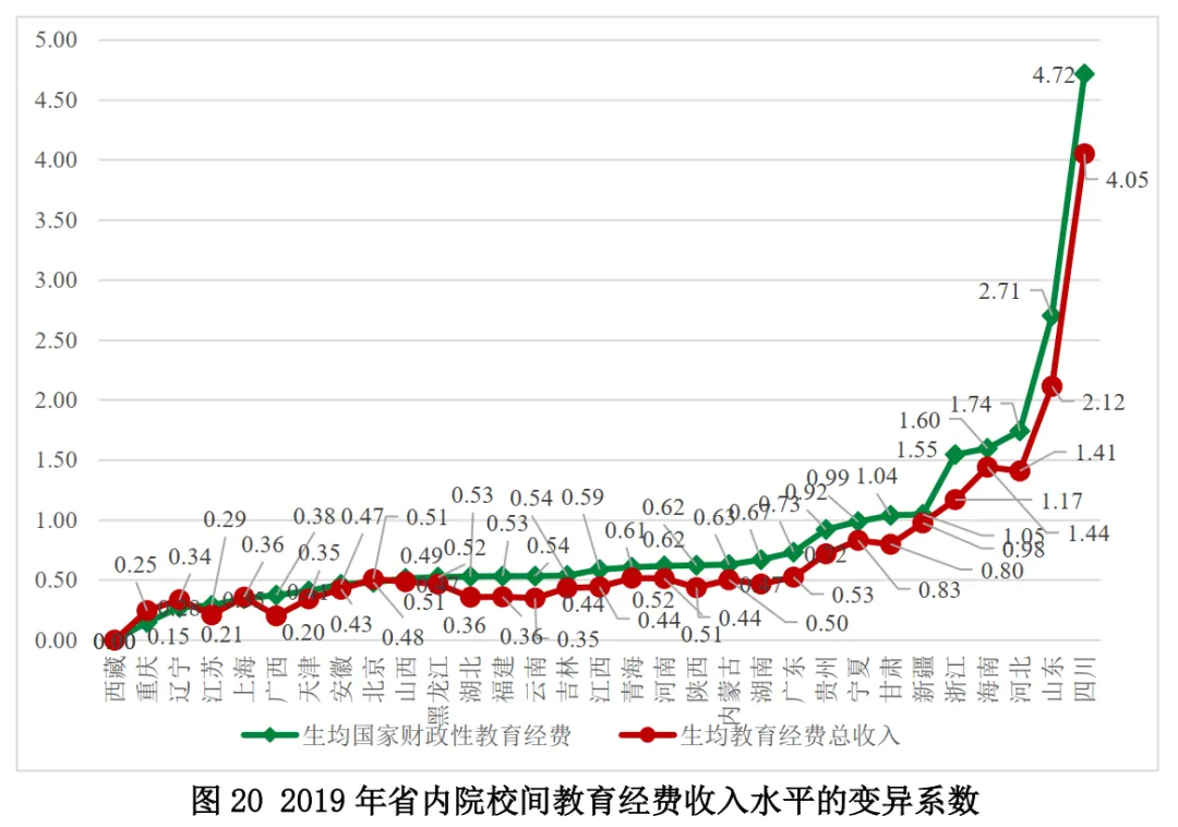 從2019年各省份生均教育經(jīng)費收入和生均財政性教育經(jīng)費收入的變異系數(shù)來看:(1)西藏、重慶、遼寧、江蘇的省內(nèi)均衡性位居前列,變異系數(shù)小于0.4;(2)四川、山東、河北和海南位居最末,變異系數(shù)大于1.0。山東和四川兩個指標(biāo)的變異系數(shù)大于2.0,遠(yuǎn)高于省際間同類指標(biāo)的變異系數(shù)。除了少數(shù)例外,各省份的生均財政性教育經(jīng)費收入變異系數(shù)均大于生均教育經(jīng)費總收入的變異系數(shù),這表明財政性投入沒有縮小省內(nèi)院校間的收入差距。(圖20)
