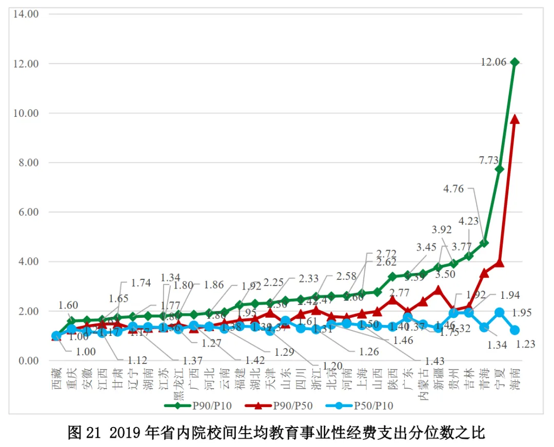2019年各省份生均教育事業(yè)性經(jīng)費支出的分位數(shù)之比表明:(1)西藏、重慶、安徽的省內(nèi)均衡性均位居前列;(2)海南、寧夏、青海位居最末。其中,海南、寧夏、青海內(nèi)部生均教育事業(yè)性經(jīng)費支出的最高90%的學(xué)校與最低10%學(xué)校差異最大,且這種差異主要是由于最高90%與中位數(shù)學(xué)校的差異過大,這表明這三個省份內(nèi)部教育經(jīng)費投入的均衡性相對較差。(圖21)