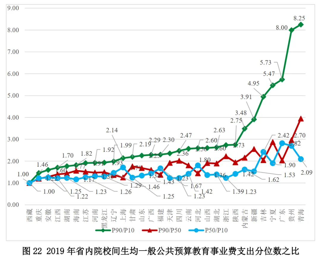 2019年各省份生均一般公共預(yù)算教育事業(yè)費支出分位數(shù)之比表明:(1)西藏、重慶、安徽的省內(nèi)均衡性均依然位居前列。(2)青海、貴州、廣東省內(nèi)部生均一般公共預(yù)算教育事業(yè)費支出的最高90%院校與最低10%院校差異最大,廣東是由于中位數(shù)與最低10%院校之間差異較大,青海和貴州則是由于最高90%與中位數(shù)院校差異較大,這表明這三個省份內(nèi)部教育財政投入的均衡性不高,且原因不同。(圖22)