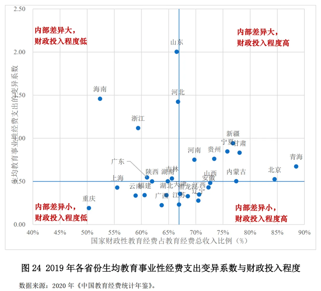 從生均教育事業(yè)性經(jīng)費支出的變異系數(shù)與財政投入程度來看,(1)廣東、海南、浙江等省份內(nèi)部的院校間均衡性較弱;(2)廣西、江蘇、遼寧、重慶等省份內(nèi)部的院校間均衡性較強(qiáng);(3)在內(nèi)部差異較大省份中,海南、浙江、廣東等省份的財政投入程度較低,多數(shù)西部省份和北京的財政投入程度較高;(4)在內(nèi)部差異性較小的省份中,重慶、上海、云南等省份的財政投入程度較低,安徽、江西、遼寧、黑龍江等中部和東北地區(qū)省份的財政投入程度相對較高。(圖24)