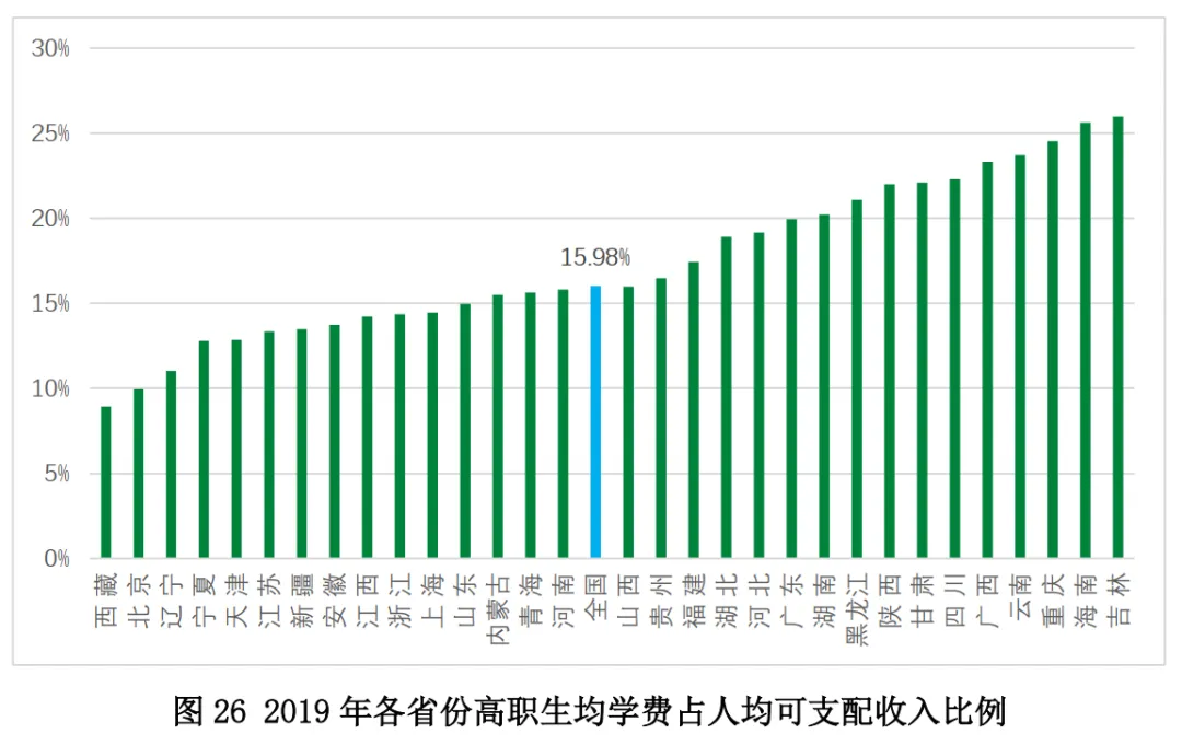 第五,當(dāng)前,我國高等職業(yè)教育整體居民負(fù)擔(dān)率較高。我國高職教育的人均居民負(fù)擔(dān)率為15.98%,其中吉林最高(25.97%),西藏最低(8.92%),兩個省份相差約2倍。
