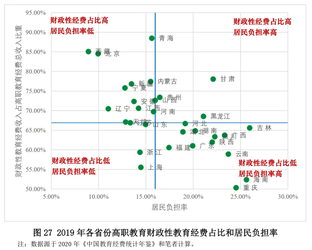我國各省份高職教育的財政性教育經(jīng)費占比與居民負(fù)擔(dān)率呈現(xiàn)出不同類型:(1)第一種類型是財政性教育經(jīng)費占比高、居民負(fù)擔(dān)率低,例如青海、西藏、北京等;(2)第二種類型是財政性教育經(jīng)費占比低,居民負(fù)擔(dān)率高,例如海南、重慶、云南等;(3)第三種類型是財政性教育經(jīng)費占比和居民負(fù)擔(dān)率都高,例如甘肅、貴州、黑龍江等;(4)第四種類型是財政性教育經(jīng)費占比和居民負(fù)擔(dān)率都低,例如浙江、上海等省份。(圖27)