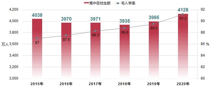 2020年,全國(guó)高中階段共有學(xué)校2.44萬所。招生1504.00萬人,在校生4127.80萬人。高中階段毛入學(xué)率91.2%。