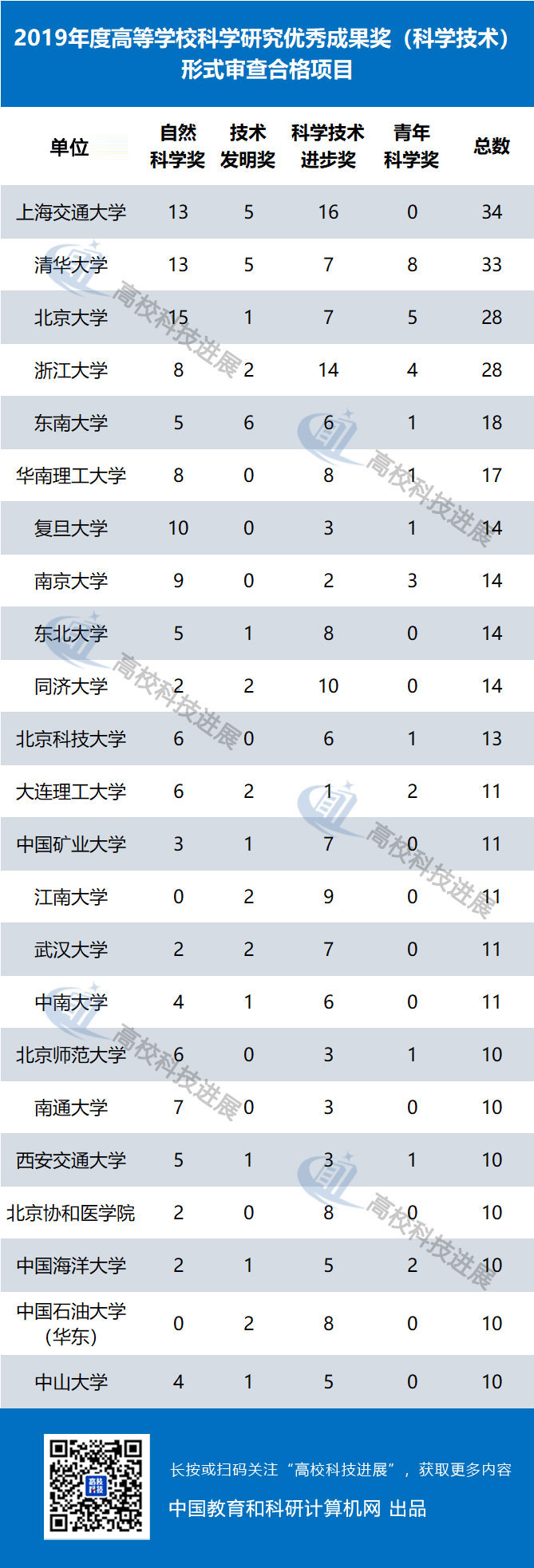 科學(xué)技術(shù)進(jìn)步獎共有422項(xiàng)(通用項(xiàng)目406項(xiàng),專用項(xiàng)目16項(xiàng))形式審查合格。在通用項(xiàng)目的統(tǒng)計(jì)結(jié)果中,共有167所高校以第一完成單位牽頭的項(xiàng)目通過審查。形式審查合格項(xiàng)目較多的高校分別是上海交通大學(xué)16項(xiàng),浙江大學(xué)14項(xiàng),同濟(jì)大學(xué)10項(xiàng),江南大學(xué)9項(xiàng),北京協(xié)和醫(yī)學(xué)院、東北大學(xué)和中國石油大學(xué)(華東)均為8項(xiàng),北京大學(xué)、清華大學(xué)、武漢大學(xué)和中國礦業(yè)大學(xué)各有7項(xiàng),北京科技大學(xué)、東南大學(xué)、中南大學(xué)、首都醫(yī)科大學(xué)、江蘇大學(xué)分別有6項(xiàng),北京林業(yè)大學(xué)、中國礦業(yè)大學(xué)(北京)、中國醫(yī)科大學(xué)、河海大學(xué)、中國海洋大學(xué)、華中科技大學(xué)、中山大學(xué)、華南理工大學(xué)、中國人民解放軍海軍軍醫(yī)大學(xué)以及五邑大學(xué)各有5項(xiàng)。