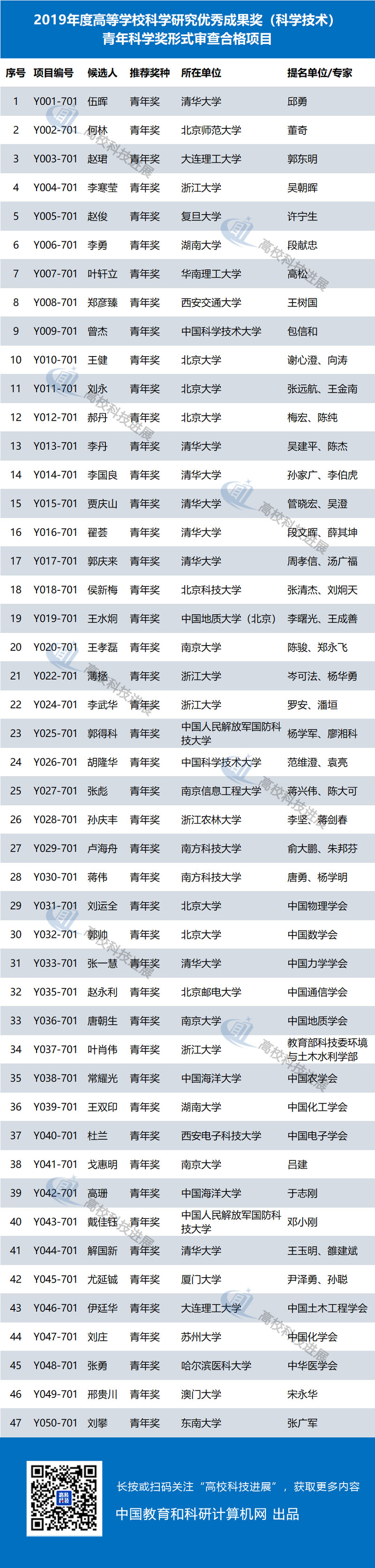 7月22日,2019年度高等學(xué)??茖W(xué)研究優(yōu)秀成果獎(科學(xué)技術(shù))推薦/提名工作已結(jié)束。教育部科技司組織對候選項(xiàng)目/候選人進(jìn)行了形式審查,確定形式審查合格941項(xiàng)/人(含專用項(xiàng)目32項(xiàng)),不合格92項(xiàng),形式審查過程中,推薦/提名單位或?qū)<姨岢龀蜂N推薦/提名13項(xiàng)。形式審查合格項(xiàng)目中,自然科學(xué)獎347項(xiàng),技術(shù)發(fā)明獎125項(xiàng)(通用項(xiàng)目109項(xiàng),專用項(xiàng)目16項(xiàng)),科學(xué)技術(shù)進(jìn)步獎422項(xiàng)(通用項(xiàng)目406項(xiàng),專用項(xiàng)目16項(xiàng)),青年科學(xué)獎候選人47人。