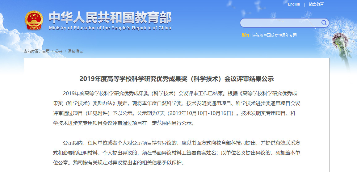 10月10日,教育部科技司正式對外公示2019年度高等學??茖W研究優(yōu)秀成果獎(科學技術)(以下簡稱“優(yōu)秀成果獎”)會議評審結果。本次評審出的自然科學獎121個、技術發(fā)明獎通用項目45個、科學技術進步獎通用項目129個,共計295個獎項。