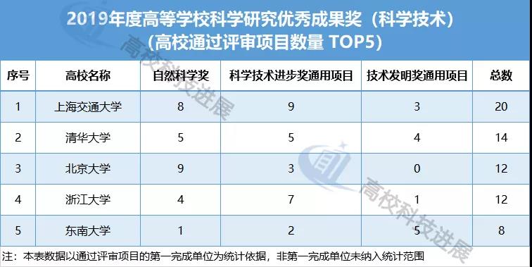 作為第一完成單位,上海交通大學、清華大學、北京大學、浙江大學、東南大學通過評審的優(yōu)秀成果獎項目數(shù)量分別為20個、14個、12個、12個、8個,在總數(shù)上成功挺進前五強(本文高校獲評審通過的項目數(shù)量,均為各高校作為第一完成單位完成的項目)。南京大學、四川大學、中國農(nóng)業(yè)大學、江南大學、中國石油大學(華東)、華南理工大學等高校也展現(xiàn)出了不俗的實力,“斬獲”獎項數(shù)量均在5個以上。