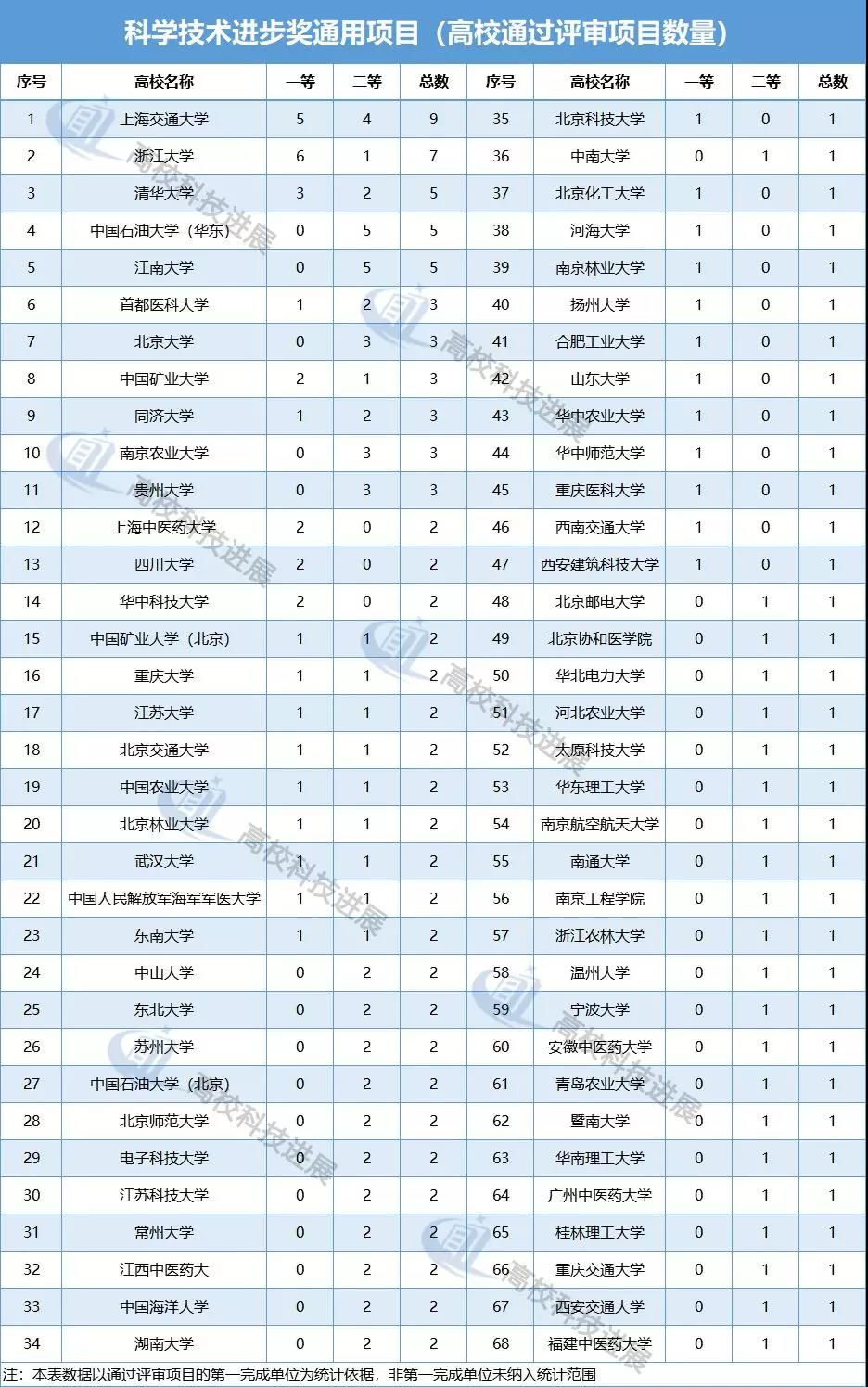 從科學技術進步獎通用項目的會議評審結果來看,共有68所高校推薦項目通過評審,獲通過項目的高校數(shù)量與自然科學獎相差無幾。