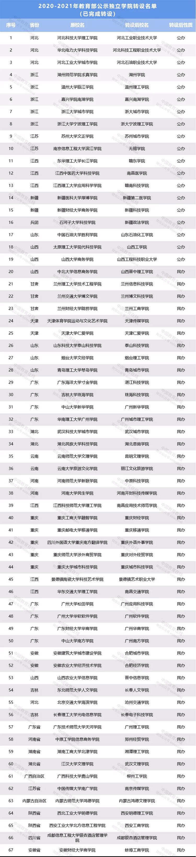 自方案實施以來,很多獨立院校提交轉(zhuǎn)設工作方案并完成轉(zhuǎn)設,一批“新大學”出現(xiàn)在公眾視野,這些高校多數(shù)是更名后的獨立學院。距離2021年高考不足10天,不少同學及家長已經(jīng)開始注意高校的招生情況,本期中國教育在線整理了已完成更名轉(zhuǎn)設的高校名單,及已通過教育部、教育廳公示的高校名單,以供參考。