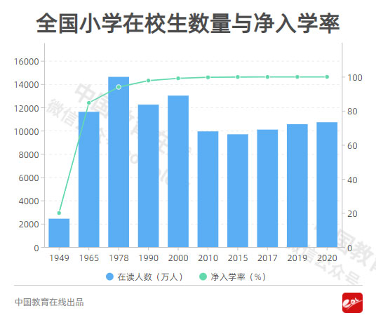 小學(xué)從建國時(shí)期入學(xué)率20%到2020年達(dá)到99.96%