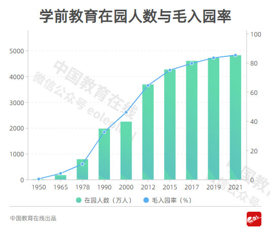 1950年,我國幼兒園數(shù)1799所,在園幼兒僅為14萬人,毛入園率0.4%。