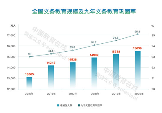 2015年,全國共有義務(wù)教育階段在校生1.3億人,義務(wù)教育鞏固率為93%,到2020年,全國共有義務(wù)教育階段在校生1.56億人,九年義務(wù)教育鞏固率95.2%,比2015年提高了2.2個(gè)百分點(diǎn)。