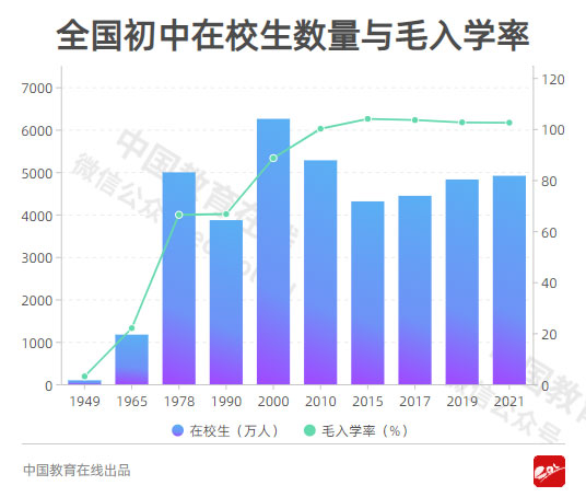 建國初期的中國,中學(xué)在校生不超過100萬人,為95萬人,毛入學(xué)率3.1%。1978年,全國初中在校生人數(shù)達(dá)到4995萬人,毛入學(xué)率66.4%。