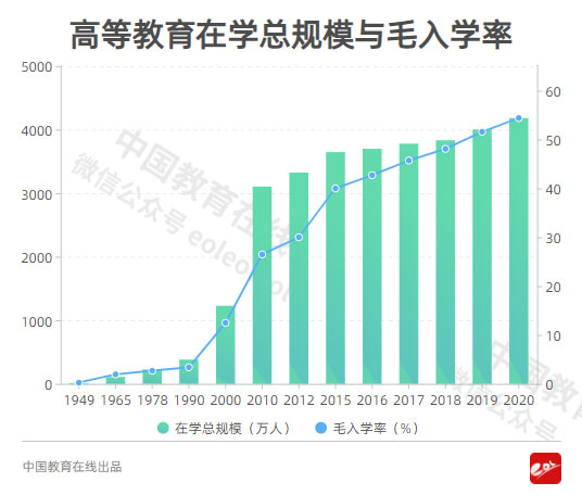 隨著高校的進(jìn)一步擴(kuò)招,全國高等教育總規(guī)模在之后幾年又迅速增長,2010年已達(dá)到3105萬人。2014年,在校生規(guī)模達(dá)到3559萬人,居世界第一。2020年,全國各類高等教育在學(xué)總規(guī)模達(dá)到4183萬人。