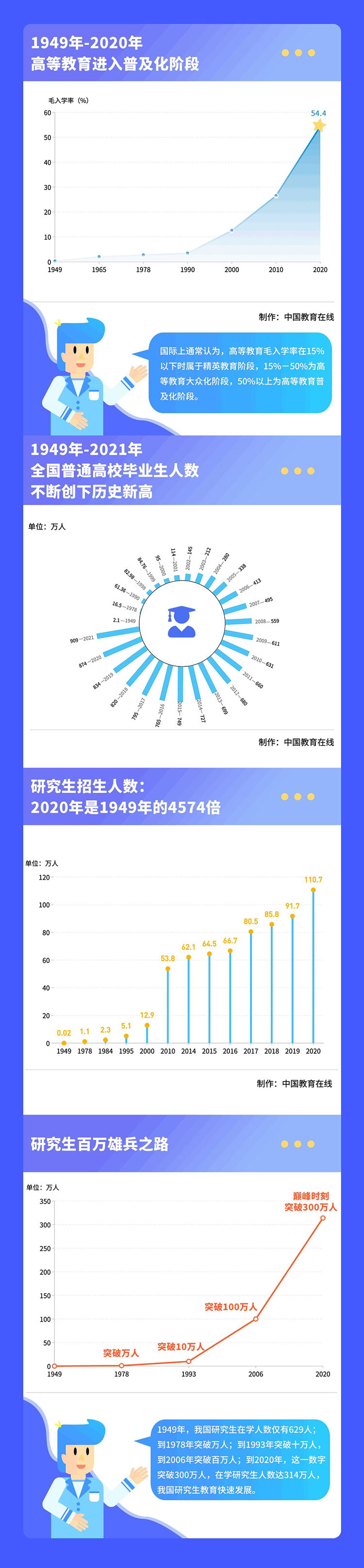 2020年,我國全年研究生教育招生110.7萬人,大約是1949年的4574倍,是1978年的103倍。