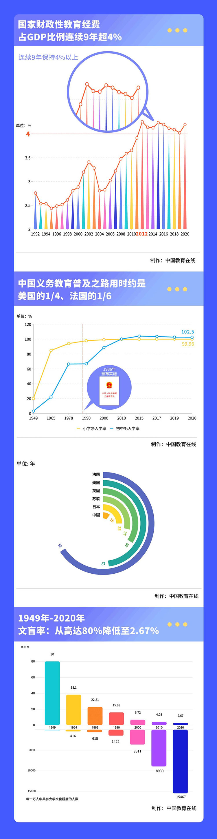 義務(wù)教育是中國的百年夢想。新中國成立之初,學(xué)齡兒童入學(xué)率只有20%。