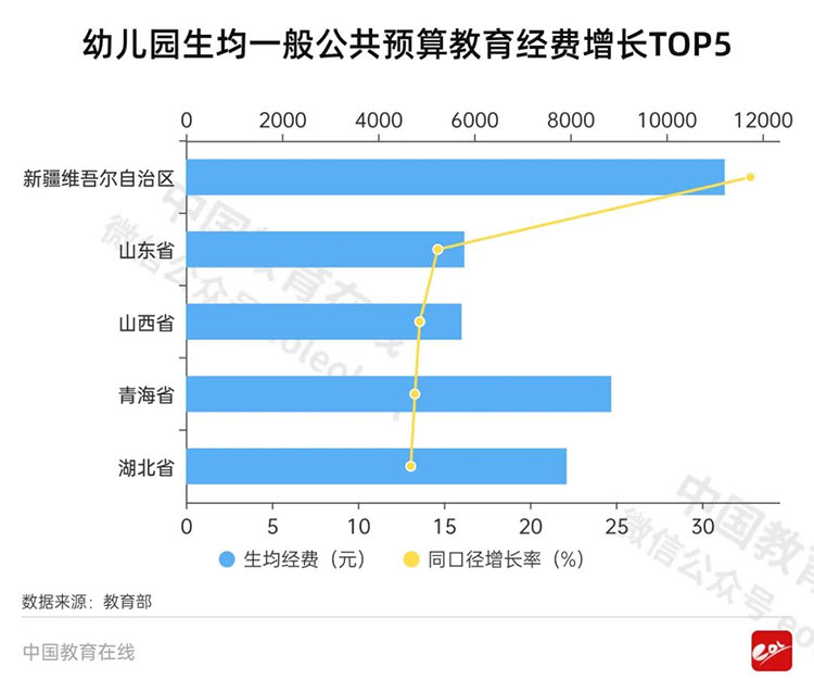 全國(guó)幼兒園為9505.84元,同口徑比上年增長(zhǎng)4.68%。各省區(qū)市中,增長(zhǎng)最快的是新疆維吾爾自治區(qū)(32.81%)。其次為山東省(14.64%)、山西省(13.59%)、青海省(13.31%)、湖北省(13.07%)。