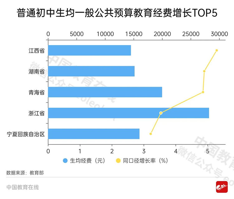 全國(guó)普通初中為17772.06元,同口徑比上年增長(zhǎng)1.74%。各省區(qū)市中,增長(zhǎng)最快的是江西省(5.29%)。其次為湖南省(4.9%)、青海省(4.86%)、浙江省(3.54%)、寧夏回族自治區(qū)(3.22%)。