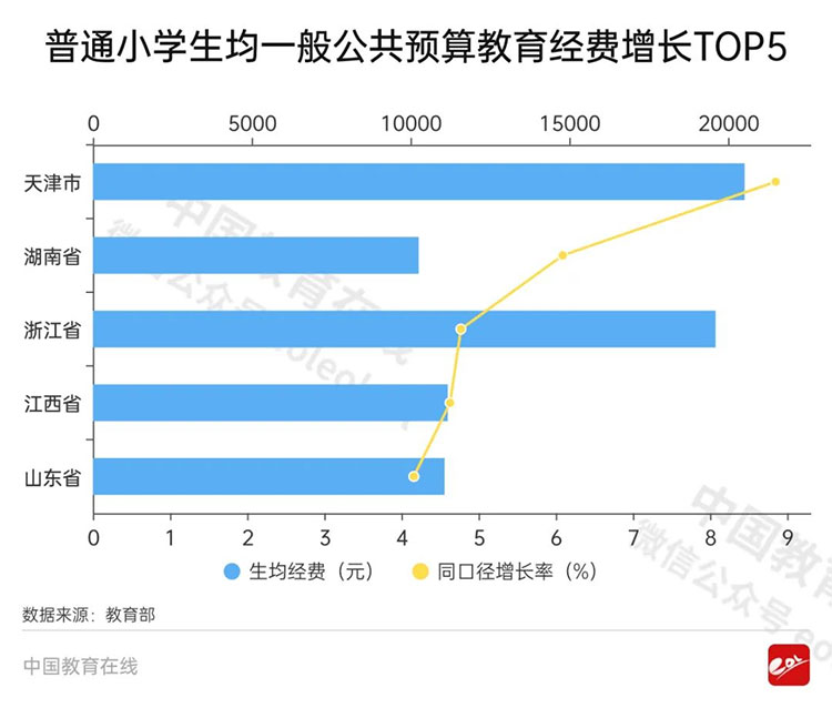 全國(guó)普通小學(xué)為12380.73元,同口徑比上年增長(zhǎng)2.22%。各省區(qū)市中,增長(zhǎng)最快的是天津市(8.85%)。其次為湖南省(6.09%)、浙江省(4.77%)、江西省(4.63%)、山東省(4.16%)。