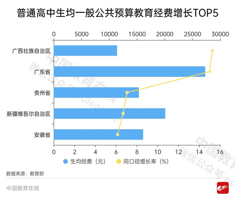 全國(guó)普通高中為18808.71元,同口徑比上年增長(zhǎng)2.95%。各省區(qū)市中,增長(zhǎng)最快的是廣西壯族自治區(qū)(15.29%)。其次為廣東省(15.02%)、貴州省(7.07%)、新疆維吾爾自治區(qū)(6.69%)、安徽省(6.15%)。