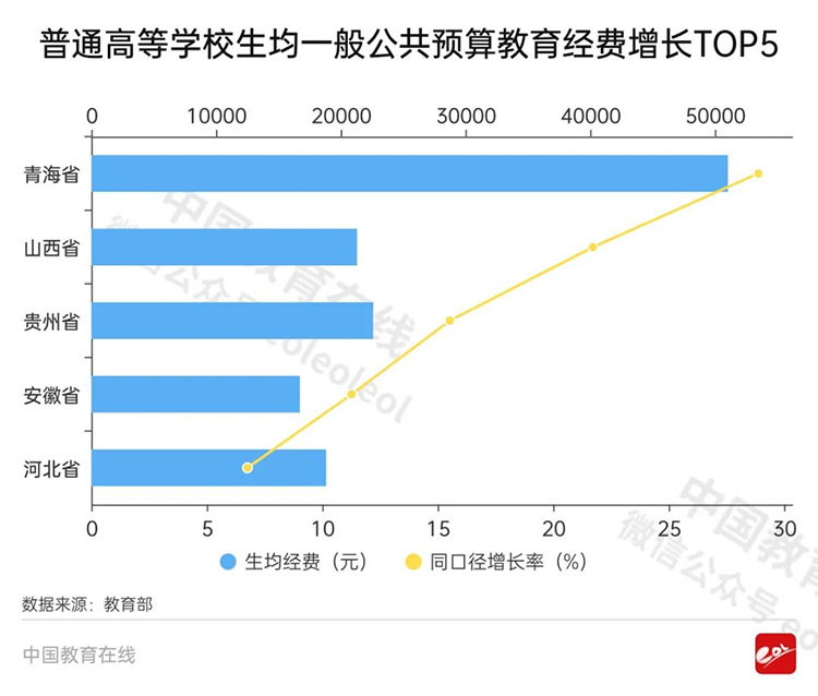 普通高校階段,大學(xué)生生均經(jīng)費(fèi)為22586.42元,同口徑比上年增長(zhǎng)1.65%。增長(zhǎng)最快的是青海省(28.88%)。其次為山西省(21.72%)、貴州省(15.52%)、安徽省(11.27%)、河北省(6.76%)。